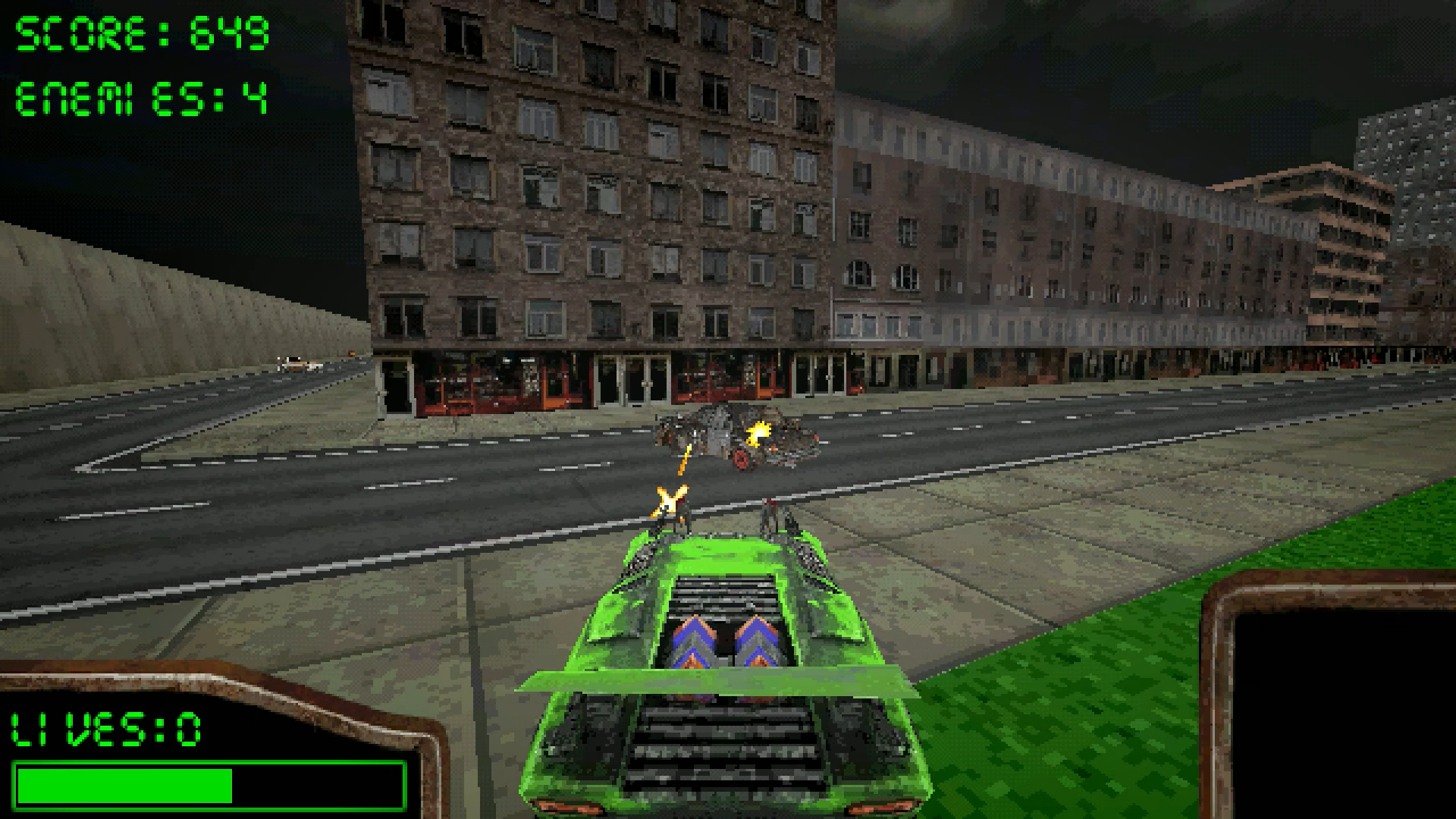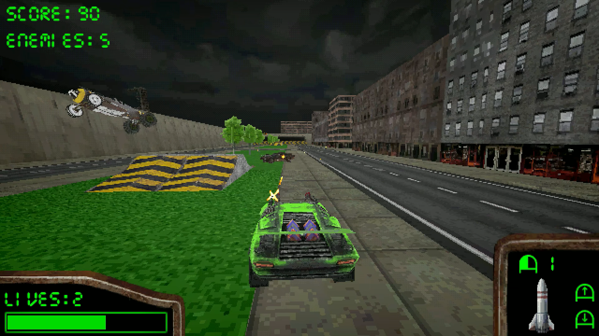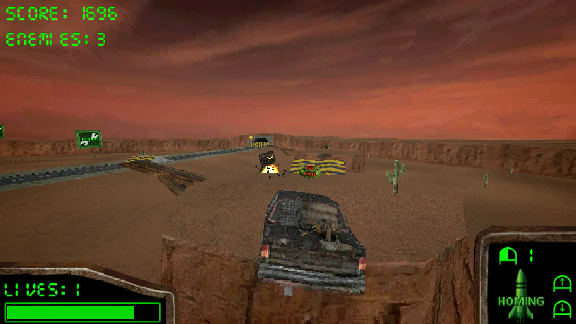 A combat vehicle game inspired by classic PS1 titles such as Twisted Metal and Carmageddon.